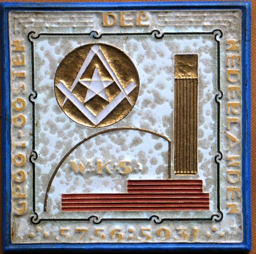 DER NEDERLANDEN W.K.S. 5756:5931 Wijsheid, Kracht en Schoonheid 1756 - 1931 175 jarig bestaan van Groot-Oosten der Nederlanden Vrijmetselarij 175th anniversary of the Masonic Lodge in the eastern part of the Netherlands. At the bottom right corner is a capital “J” with ”w” in round hand -perhaps the designer’s initials? |
