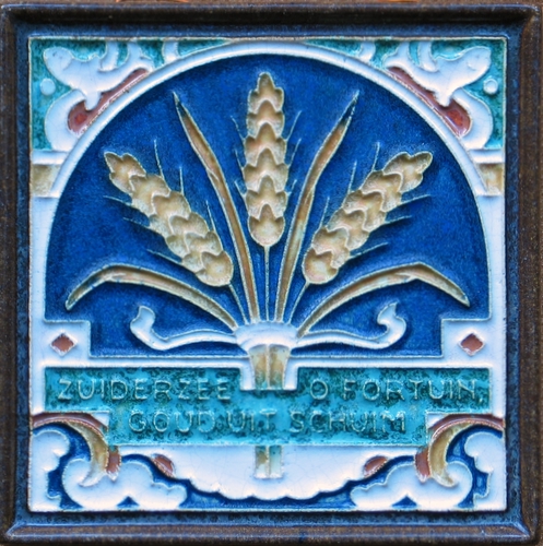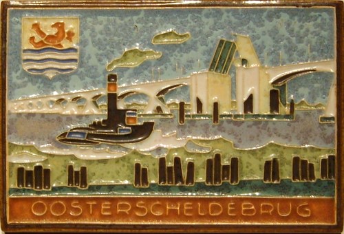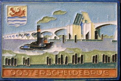 This bridge, with a length of 5km, was opened in 1960. Whilst it crosses the Oosterschelde, the correct name of the bridge is “Zeelandbrug”. The tile carries the coat of arms of the Zeeland province |