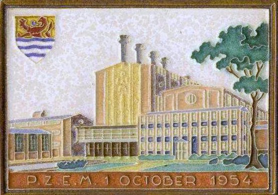 P.Z.E.M. 1 October 1954 P.Z.E.M. stands for “Power Supply Company of the Zeeland Province”. This tile was made on the occasion of the official opening of the newly constructed power station “Zeeland”, the first one built after WW II. |