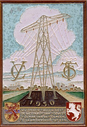 1915 YC 1900 TCS 1950 WIJ DIENEN ‘T ALLER BEST DE WEL-VAART VAN ‘T GEWEST ‘T GEMAK VAN HET GEMEEN TE SAAM GEVOEGD TOT EEN This tile was made on the occasion of the merger between the IJssel Power Station in Zwolle and the Twente Central Power Station in Hengelo in 1950. The text on the tile reads like: “United into one force, we offer the best service, both for the prosperity of the province as well as the common good” |