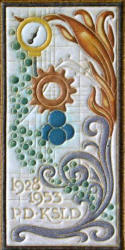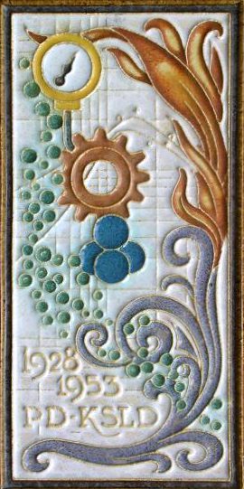 This tile was produced to celebrate the 25th anniversary of the Royal Dutch Shell Laboratory in Delft. “KSL” stands for “Koninklijke Shell Laboratorium" in Delft. The letters “PD” on the tile refer to its earlier name of “Proefstation Delft” (Test centre Delft)