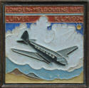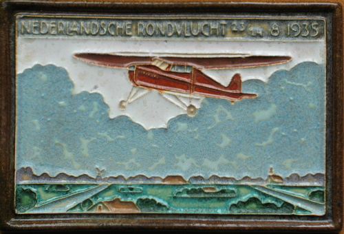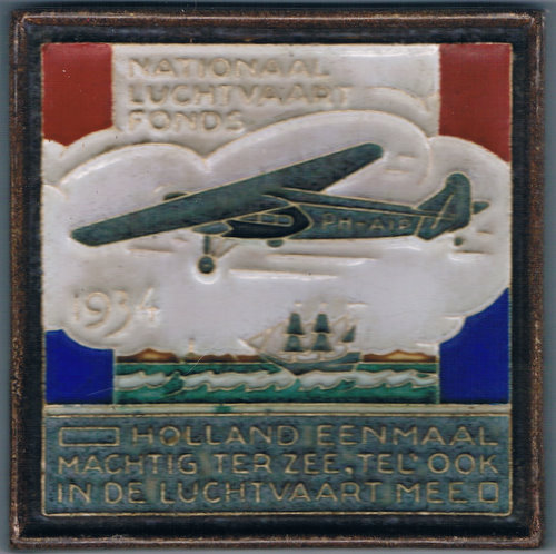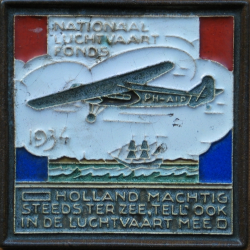 1934 This tile was issued by the National Aviation Fund in 1934 to commemorate the first flight carrying Christmas mail from Amsterdam to Batavia in 1933. A major achievement, as the journey took less than 100 hours. The aircraft shown is the “Pelikaan”, Fokker F XVIII, with registration number PH-AIP. The text on the tile translates as: “Holland powerful at sea, now also competes in the air”