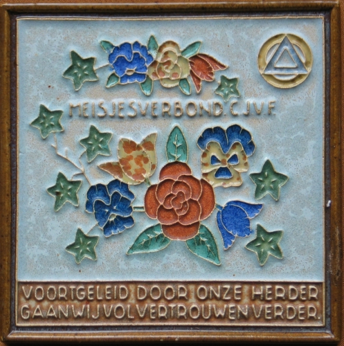 Meisjesverbond CJVF Christelijke Jonge Vrouwen Federatie Christian Federation of Young Women; the -translated- text at the bottom reads: “Guided by our Shepherd we move on, full of confidence” |