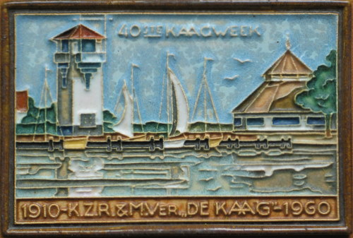"DE KAAG" -1960 This tile was made to commemorate the 50th anni- versary of a well known Dutch boating club “de Kaag”. As a special gesture, on the day of the jubilee, a dinner was organised, the menu of which was attached to the back of the tile, with each member received a tile at the table |